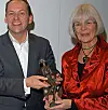 Statsråd Tora Asland overrekker prisen til adm. direktør Leif Atle Viken i Coca-Cola Drikker.