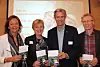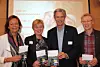 Ingrid Finboe Svendsen fra Arbeidstilsynet, Erna Hagensen fra Arbeidsmandsforbundet, Jon Sandnes fra BNL og Steinar Krogstad fra Fellesforbundet med den nye brosjyren "Forstår du hva jeg sier?", om krav til kommunikasjon og språk på bygge- og anleggsplassen. (Foto: Jan Tveita)